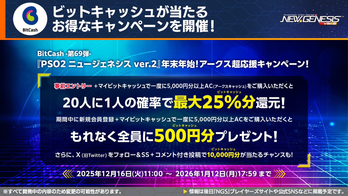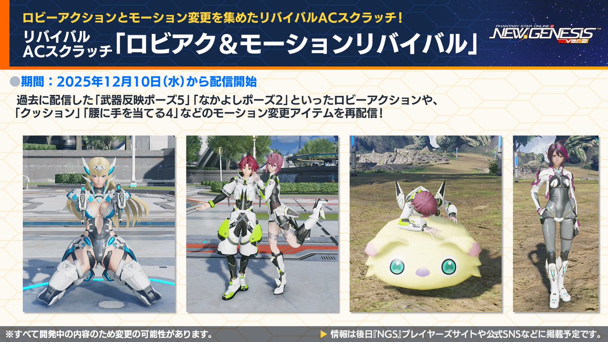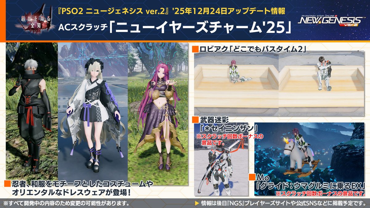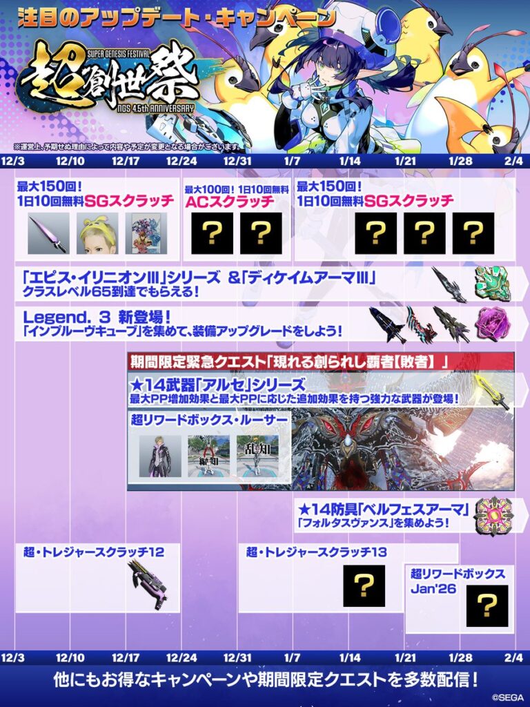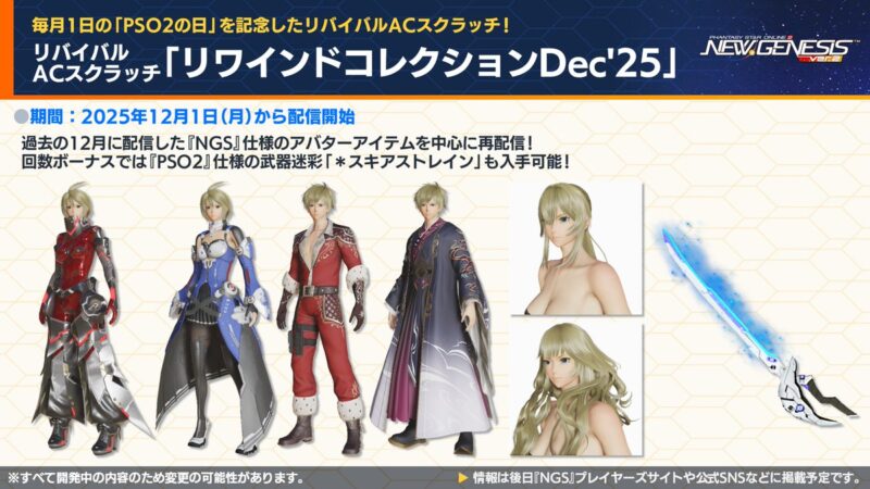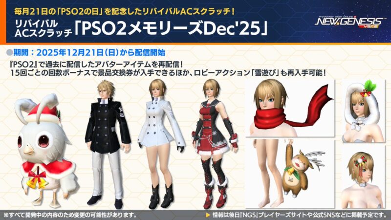 | 12月3日 | ・ブーストキャンペーン ・リワードボックスNov’25 ・ビッグバンスクラッチ・ゴールドNov’25 ・リバイバルACスクラッチ「PSO2メモリーズNov’25」 ・ACスクラッチ「ヘアスタイルリミックス」 ・ACスクラッチ「スタイリッシュオータム’25」 |